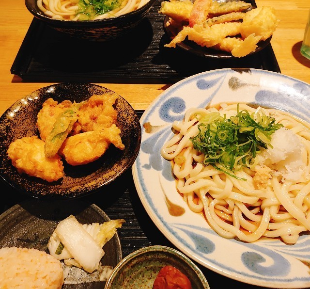 お仲間は、季節の天ぷらうどんセットに、トッピング「玉子天」。うどんは大盛り(私も💦)、鮭おにぎり付、炭水化物ばちこい、しっかり食べよう。
